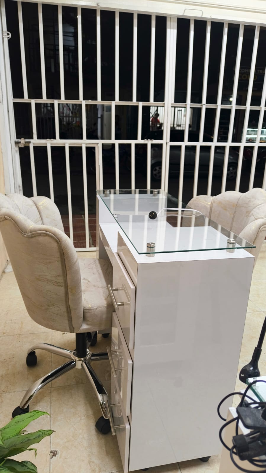 MESA CON ENCHUFE COLOR BLANCA, SILLA FLOR BASE CROMADA, SILLA FIJA Esta referencia forma parte del catalogo premium de Magilus, enfocado en sillas, estaciones y mobiliario profesional para negocios que cuidan la experiencia del cliente y la imagen del espacio.